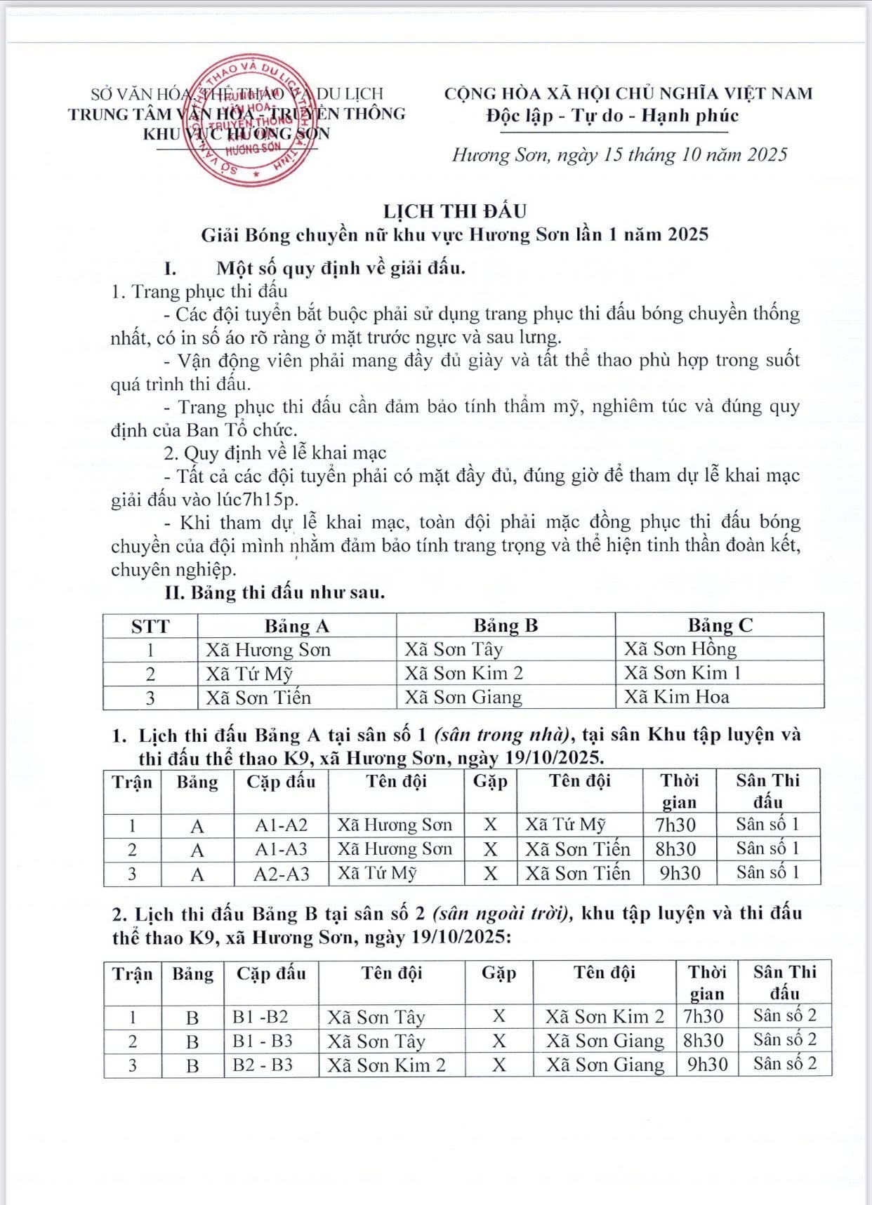 Địa điểm: Khu tập luyện và thi đấu thể thao K9 xã Hương Sơn (sân trong nhà).