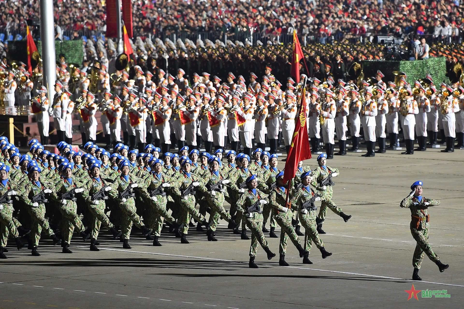 Từng hàng quân uy nghiêm, từng khối diễu binh, diễu hành tiến qua lễ đài và các tuyến đường trong tiếng nhạc hào hùng, khắc sâu niềm tự hào dân tộc.