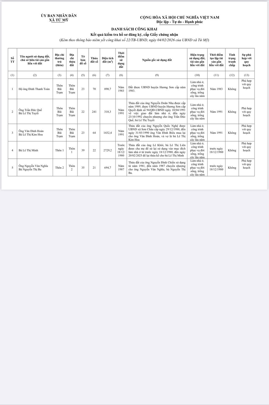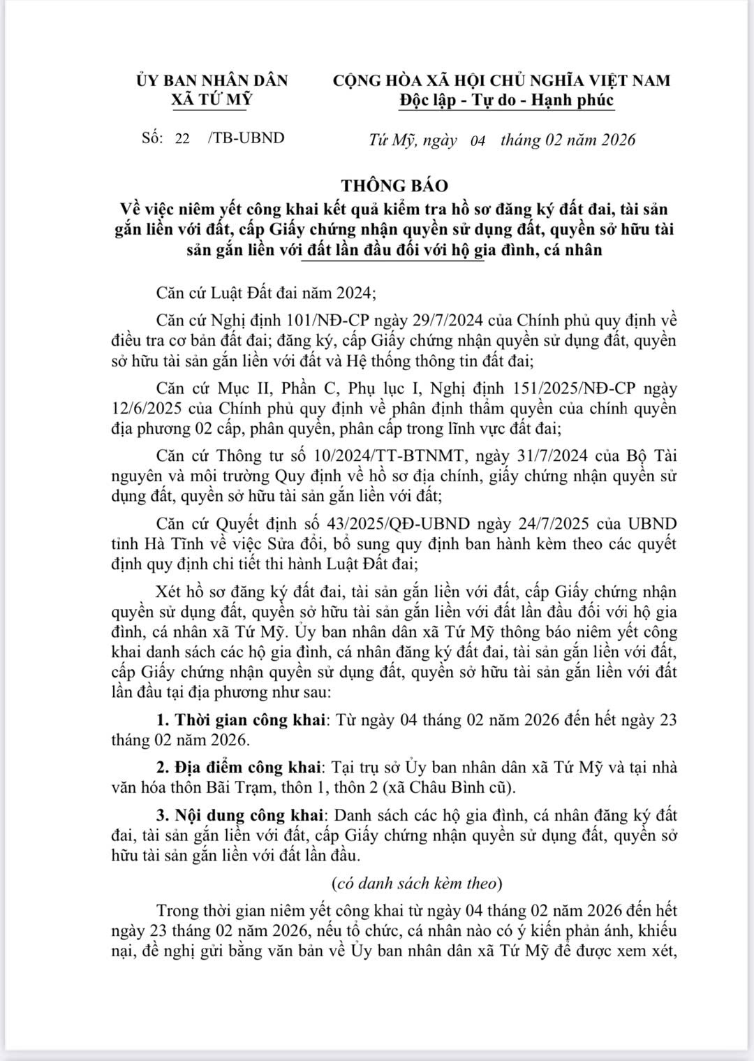 Thông báo Nguyễn Thanh Tùng04/02/2026A -A+Nguyễn Thanh Tùng04/02/2026A -A+Về việc niêm yết công khai kết quả kiểm tra hồ sơ đăng ký đất đai, tài sản gắn liền với đất, cấp Giấy chứng nhận quyền sử dụng đất, quyền sở hữu tài sản gắn liền với đất lần đầu đối với hộ gia đình, cá nhân